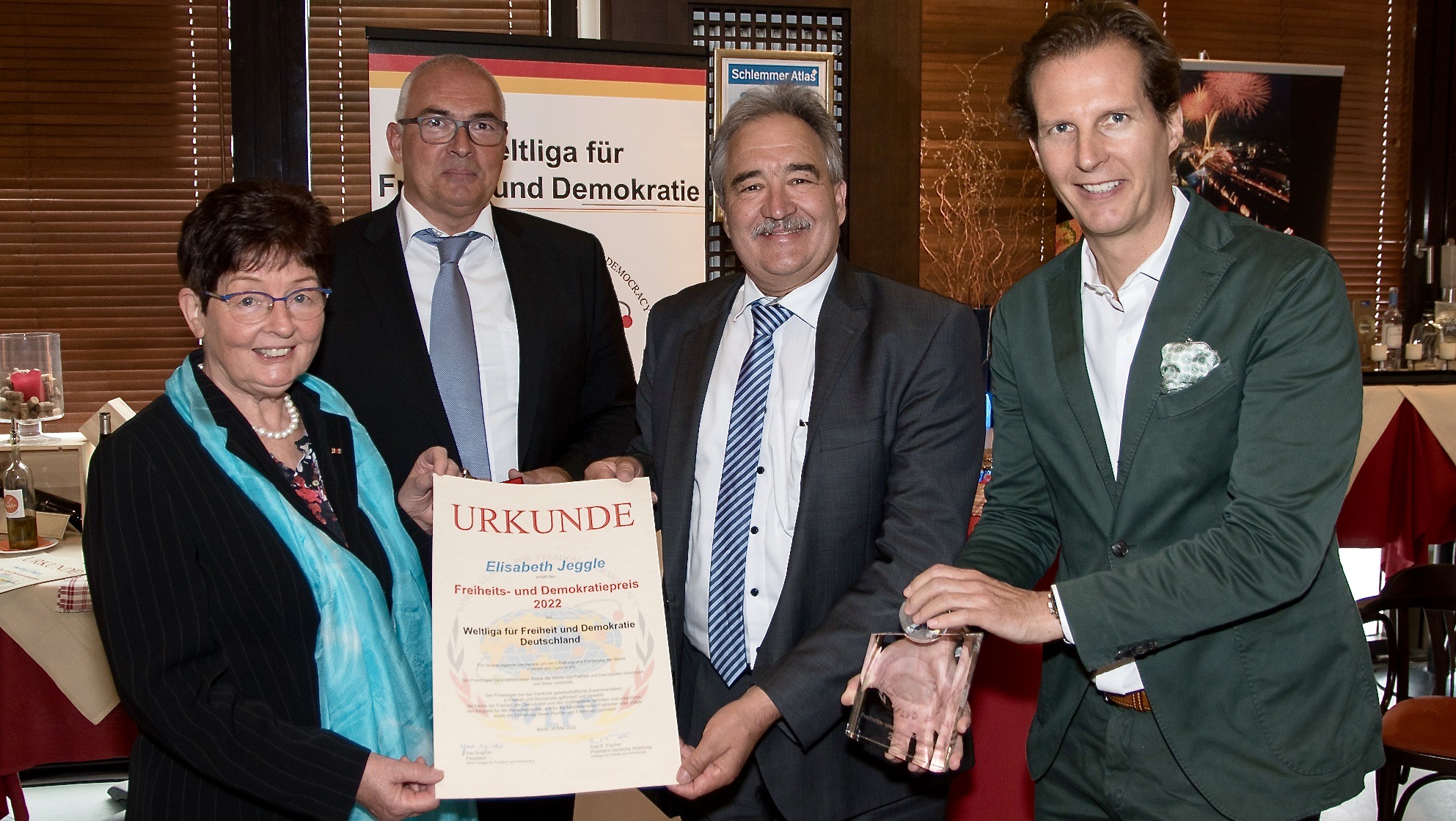 Am 31.5.2022 wurde die ehemalige Europaabgeordnete Elisabeth Jeggle von der deutschen Sektion der Weltliga für Frieden und Demokratie (WLFD) für ihr jahrzehntelanges Engagement für Freiheit und Demokratie mit dem Preis der WLFD geehrt. Weitere Preisträger sind in diesem Jahr der ehemalige baden-württembergische Innenminister Heribert Rech und der Unternehmer Frank Straub.