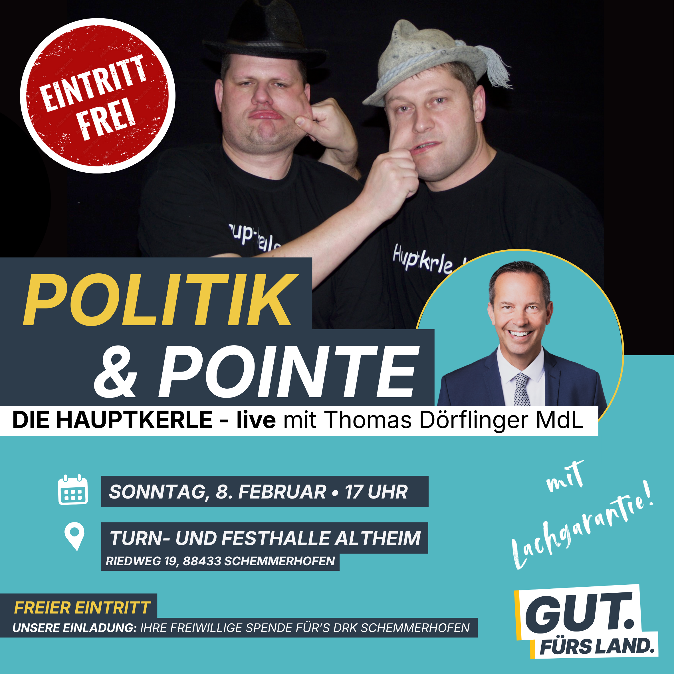 Mit den „Hauptkerle“ steht eine regional weit bekannte Comedy-Gruppe auf der Bühne, die für bodenständigen Humor, pointierte Alltagsbeobachtungen und beste Unterhaltung bekannt ist. Im Rahmen der Veranstaltung unterstützen sie den Biberacher CDU-Landtagsabgeordneten Thomas Dörflinger im Wahlkampf - humorvoll, nahbar und im direkten Austausch mit dem Publikum.