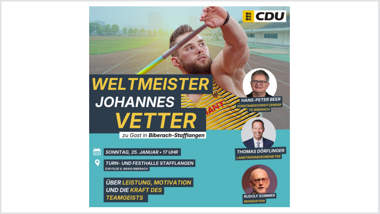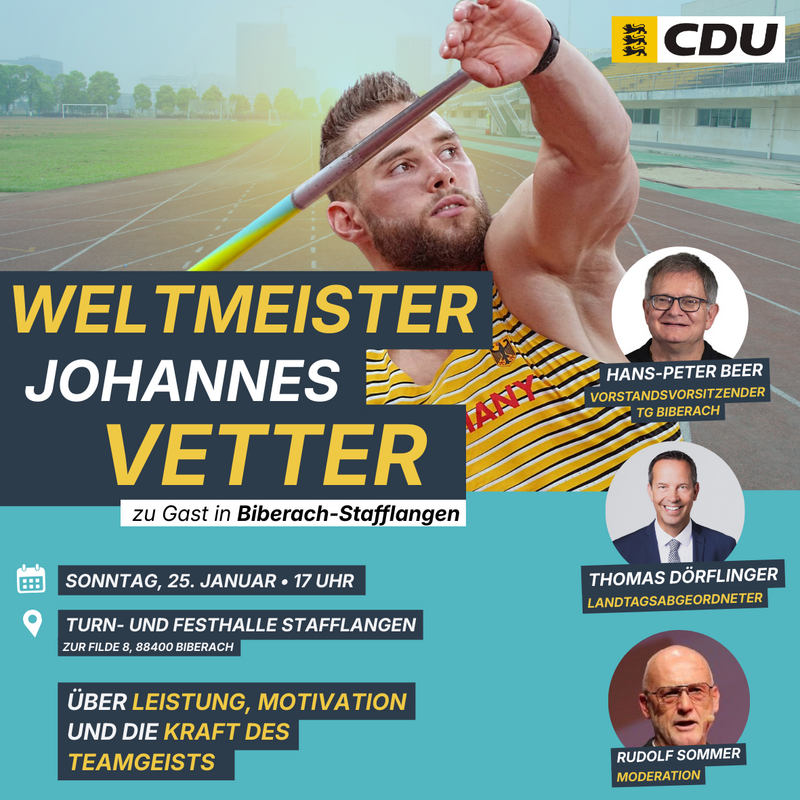 Ein sportlicher Höhepunkt für den Landkreis Biberach: Der CDU-Landtagsabgeordnete Thomas Dörflinger lädt am Sonntag, 25. Januar 2026, zu einem besonderen Talk mit dem Speerwurf-Weltmeister Johannes Vetter ein. Beginn ist um 17 Uhr in der Turn- und Festhalle Stafflangen.
