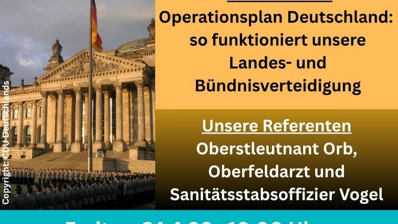 Vortrag: Die sicherheitspolitischen Entwicklungen der vergangenen Jahre haben gezeigt, wie wichtig eine belastbare, moderne und realistische Landes- und Bündnisverteidigung für Deutschland geworden ist. Vor diesem Hintergrund freuen wir uns besonders, Ihnen einen hochaktuellen Einblick in den Operationsplan Deutschland (OPLAN DEU) bieten zu können. Der Vortrag wird gehalten vom Leiter des Kreisverbindungskommandos, Oberstleutnant Orb sowie Oberfeldarzt Vogel.