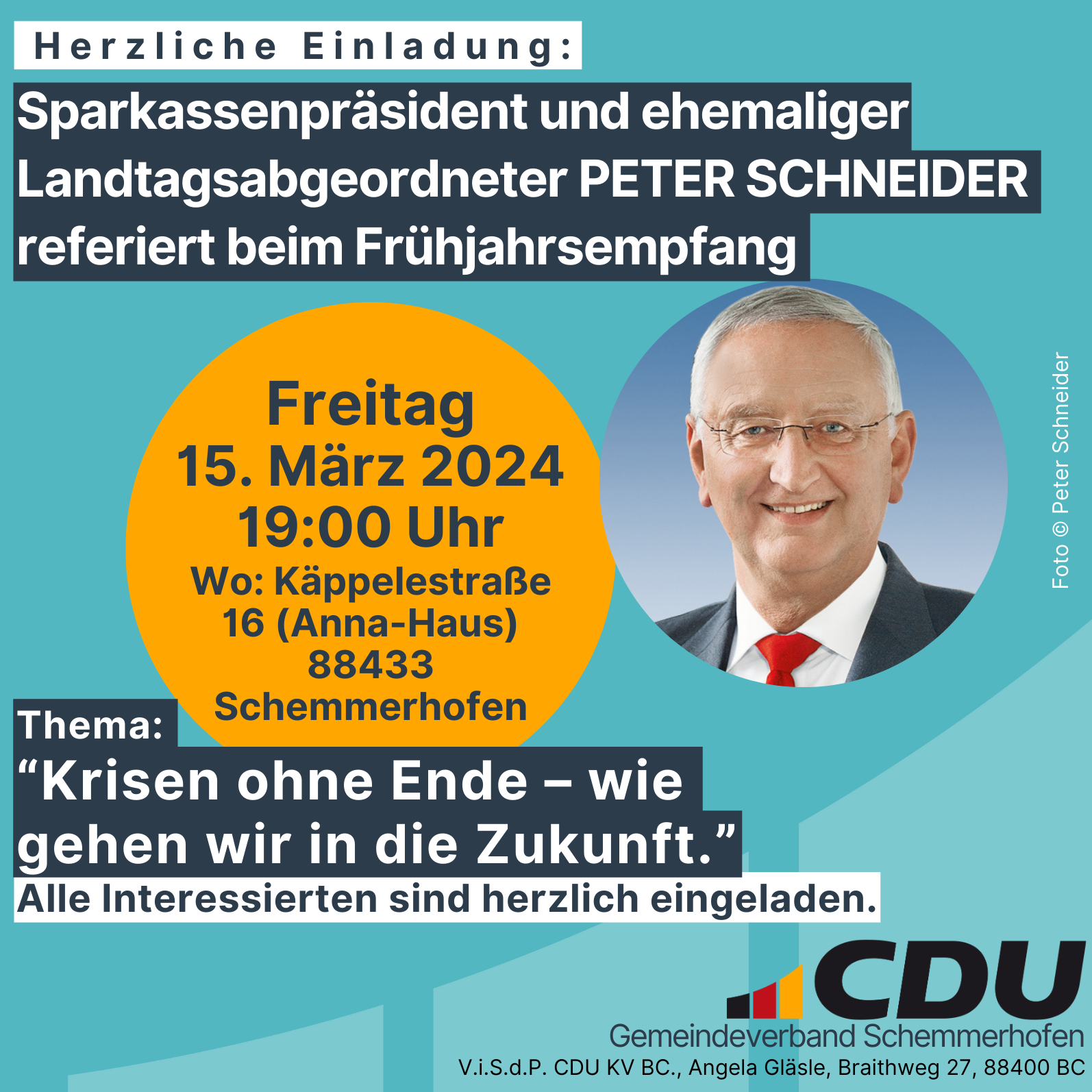 Sparkassenpräsident und ehemaliger Landtagsabgeordneter PETER SCHNEIDER referiert beim Frühjahrsempfang des CDU-Gemeindeverbandes Schemmerhofen.
